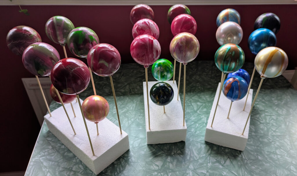 The process turned out to be as messy as it was mesmerizing. Each pour had a mind of its own, and every ornament felt like a mini adventure in color and gravity. Figuring out how to suspend them upside down so I could pour, tilt, and let the paint move naturally was its own puzzle. My first setup involved chopsticks and a wooden dish rack (very high-tech), and later I switched to skewers and styrofoam for the varnishing and final drying.